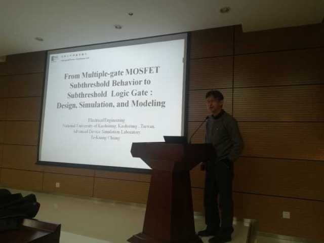 11月8日下午,受太阳成集团tyc122ccvip电子科学与技术学科的邀请,台湾高雄大学江德光教授前来公司进行学术交流,并作了题为《从多栅MOSFET的亚阈值行为到低功耗电路:设计,建模和仿真》的专题学术报告。电子科学与技术学科近100名教师和研究生聆听了报告,报告会由学科带头人余宁梅教授主持。