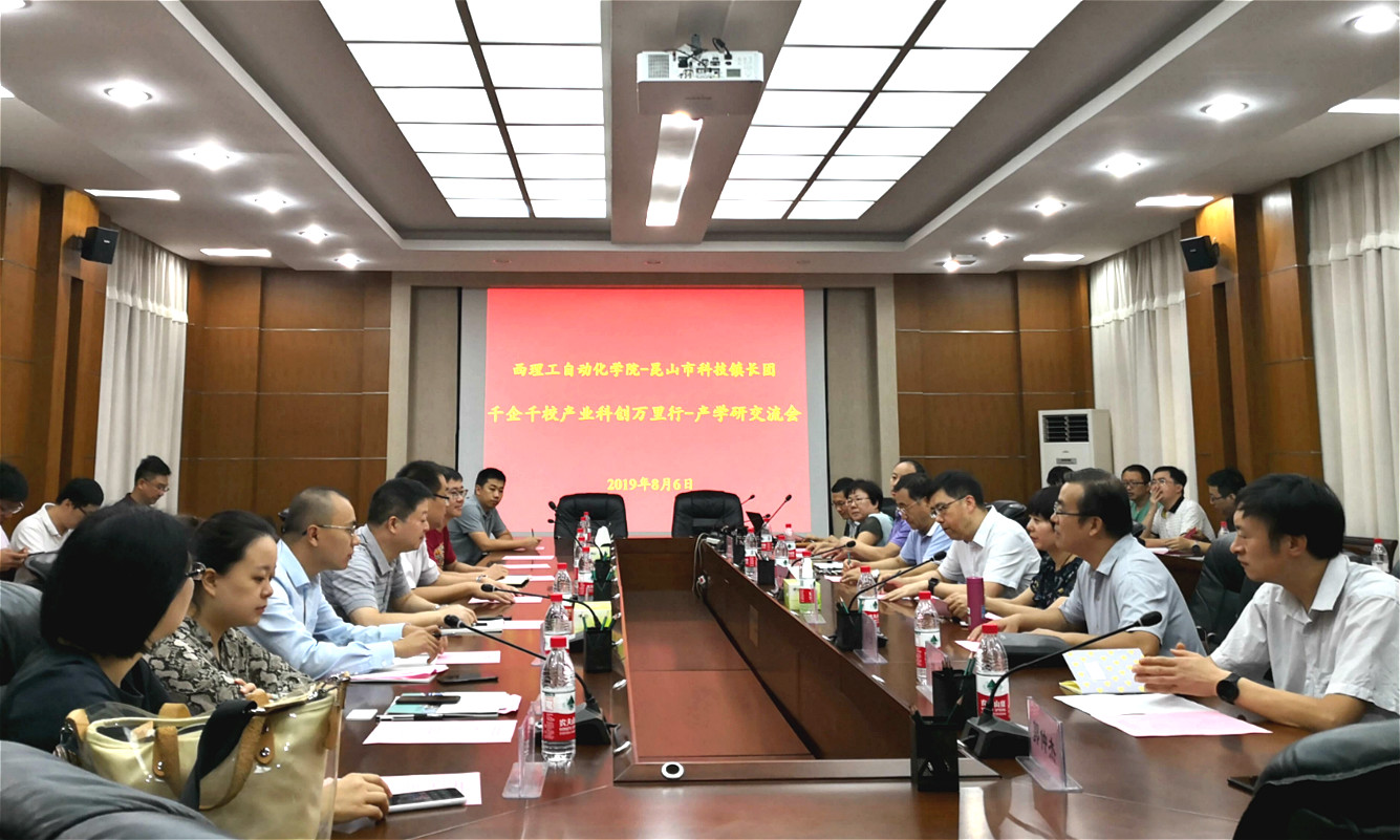 8月6日上午,公司与昆山市科技镇长团一行20人在教四楼101会议室召开产学研合作交流会。昆山市副市长肖立中、公共信用信息中心副主任汪宏韬、花桥经济发展局副局长刘雁桥、高新区科技局副局长吴凤兵,太阳成集团tyc122ccvip经理刘涵、副经理封先锋、电气系主任伍文俊、电气系支部书记宋卫章以及相关老师参加了交流会。交流会由封先锋主持。