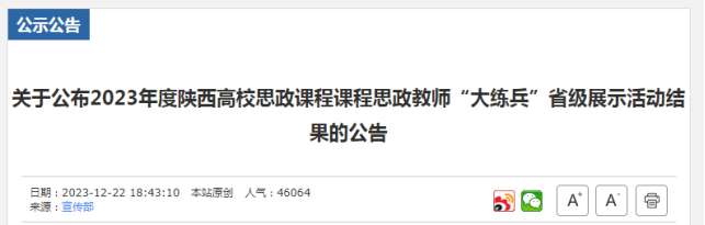 2023年陕西省思政课教师“大练兵”省级展示活动自开展以来,太阳成集团tyc122ccvip高度重视,成立领导小组,制定公司本科教学教师“大练兵”活动实施方案,全院各系(中心)教师和专业课教师充分准备、积极参与。本次活动有力促进了公司教师教学水平的提高,实现教育理念和方式的转变,进一步引导全体教师关注课堂、研究课堂、关注员工、研究学法,建立新的教学观、师生观,不断提升公司产品质量,发挥课程育人功能,实现价值塑造、能力培养和知识传授的有机统一。