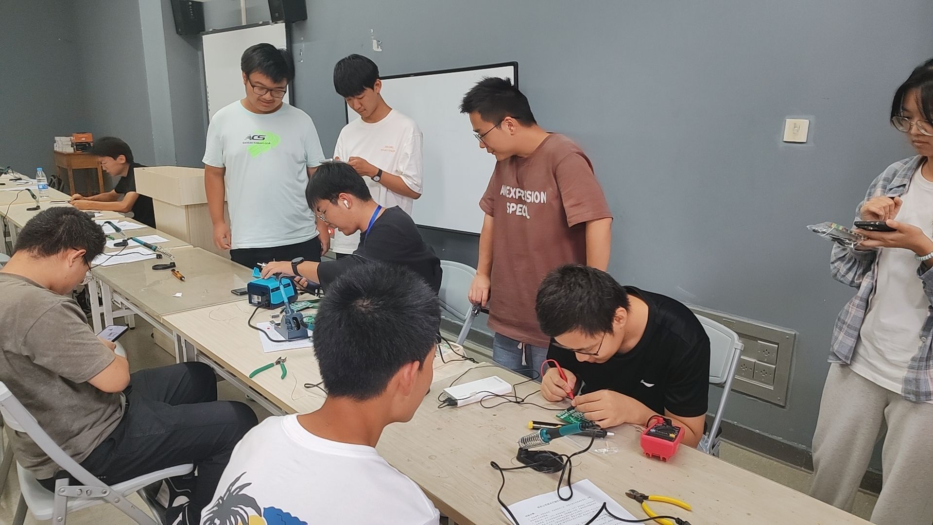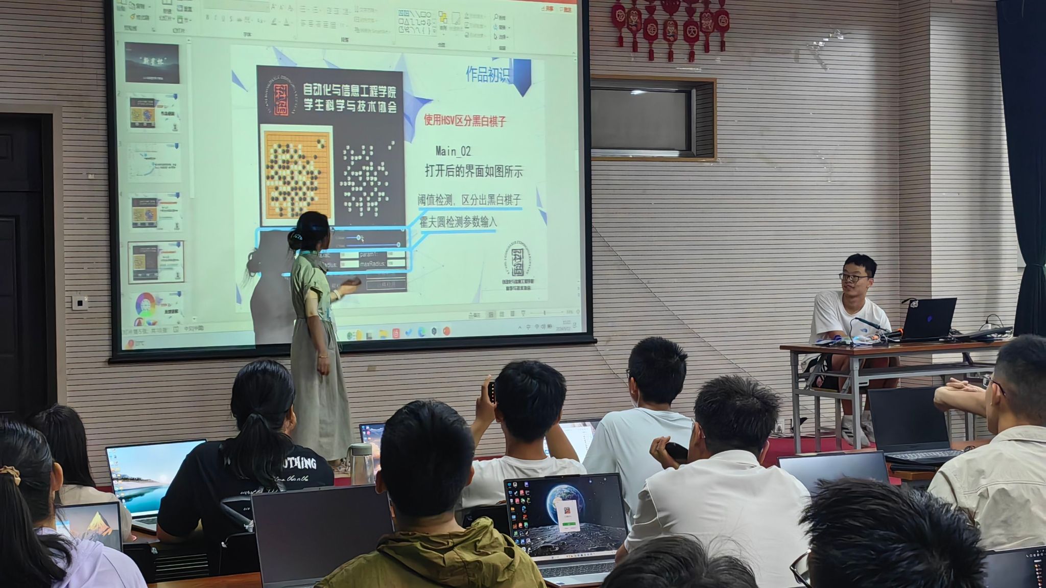 本次比赛分为硬件类与软件类两个组别。硬件组是通过焊接元器件来磨练同学们的动手能力,夯实科创竞赛基础。软件组则是通过讲解学习,帮助选手们掌握简单的软件参数调整技巧,丰富专业知识、激发科创热情。随着比赛的正式开始,硬件组的参赛选手们,从初时的忐忑迷茫迅速转变为全神贯注投入比赛。右手拿烙铁,左手放锡丝,随着一个接一个的元件被焊接到电路板上,同学们的焊接技巧也愈发熟练。软件组的比拼,则是考验大家对于霍夫圆检测算法的理解和hsv阈值调参的要点掌握情况,同学们在比赛中全神贯注、思维敏捷,不断尝试不同的参数组合,以追求最准确的解答结果。
