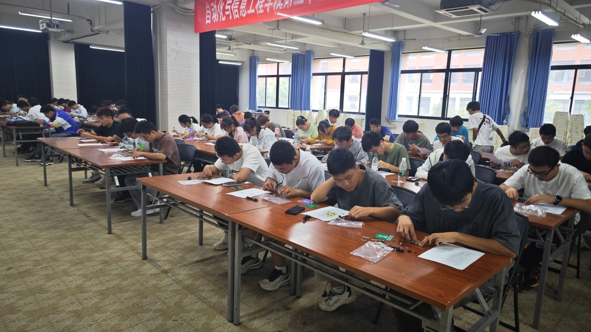 赛前准备阶段,工作人员为同学们分发对应组别的参赛元器件,并耐心地向参赛同学传授实操经验。同学们全神贯注、聚精会神地倾听,不时拿起手机拍照并详细记录关键要点,或是与桌上摆放的电子元器件仔细比对,力求在脑海中构建出清晰的操作流程,为即将开始的比赛做足准备。