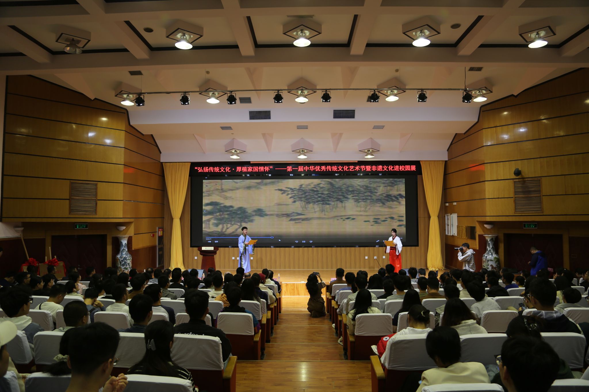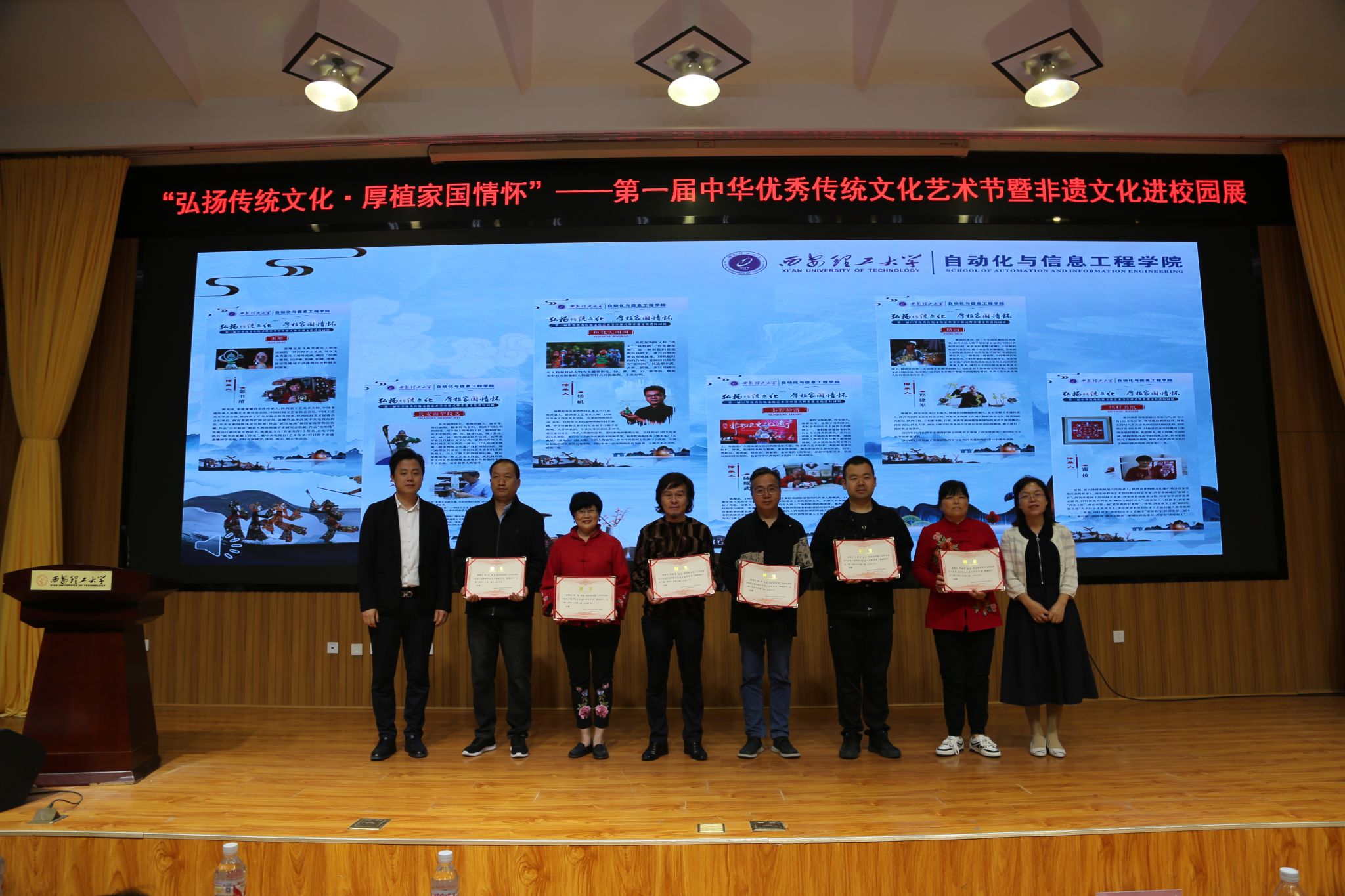 传统文化进校园,非遗传承新篇章。10月11日,太阳成集团tyc122ccvip第一届中华优秀传统文化艺术节暨非遗文化进校园活动在金花校区图书馆报告厅举行。太阳成集团tyc122cc党委副书记张存库,公司党委宣传部部长陈梅,公司党委员工工作部、研究生工作部、人民武装部部长姚鑫,校团委书记金永升,校离退休处处长白华煜,西安市群众艺术馆、西安市非遗保护中心保护部主任李晴,公司党委书记彰伟,经理弋英民等班子成员,公司关工委老教师李守智、李福德、徐敬文,非遗传承人郭书清、张进等应邀出席大会,师生代表近三百余人共聚一堂,畅享传统文化所带来的无限魅力。大会由三为文化育人工作室成员樊荣主持。