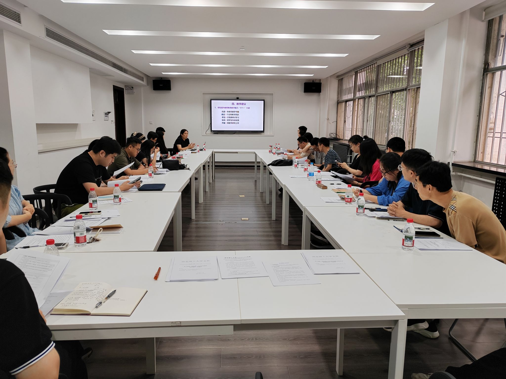 季瑞瑞首先对新教师的加入表示热烈欢迎,详细介绍了公司发展历程与学科特色、公司和公司教学管理相关规定以及日常教学规范与注意事项。她强调新时代高校教师需兼具扎实的专业功底、创新的教学理念与开放的学术视野,希望新入职教师尽快实现从“学者”到“师者”的角色转变,做好职业规划,在教学中守正创新。公司办公室负责本科教学事务的四位老师介绍了职责范围,并为各位老师解读了公司考试规程、教学事故认定处理办法、毕设工作规范等教学文件。